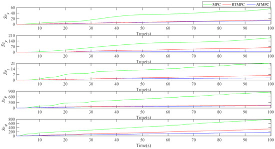 Compared with “RTMPC”, the proposed tube-based event-triggered path-tracking strategy has a smaller position and attitude angle deviations. The maximum position deviation of “ATMPC” can be reduced from 0.12 m to 0.04 m. That is a reduction of about 67%. As shown in Figure 4, compared with the position deviation in the direction and of “RTMPC”, that of “ATMPC” is almost the same in every moment. However, after about 20 s, the position deviation of is much smaller in every moment. In addition, the maximum yaw angle deviation can be reduced from 1.07° to 0.45°. That is a reduction of about 58%. As shown in Figure 4, after about 10 s, the yaw angle deviation is almost smaller in every moment. Integral deviations can intuitively show the variation trend of these position and attitude deviations in Figure 5.