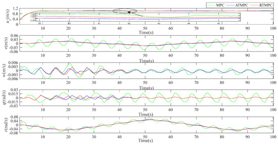 To compare control input smoothness, the range of the AUV’s speed and the control input are respectively shown in Figure 6 and Figure 7. AUV’s speed and the control input have been given in Section 3.1. As shown in Figure 6, the surge speed of “ATMPC” and “RTMPC” tracks the desired surge speed well. The sway speed, heave speed, pitch speed, and yaw speed changes in “ATMPC” and “RTMPC” occur more smoothly, compared with those of “MPC”.