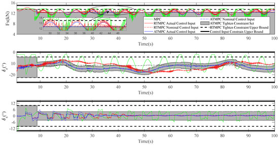 Like the vertical plane deflection shown in Figure 7, those of “RTMPC” and “ATMPC” can all avoid large periodic changes, compared with that of “MPC”. At the beginning of the simulation, the range of the vertical plane deflection of “MPC” has a tendency to be unstable. With the adaptive tight constrain introduced, the vertical plane deflection of “ATMPC” changes more smoothly. As the simulation time goes on, there is almost no oscillation phenomenon. As shown in Figure 7, the blue line is contained within the gray area, and the trend of the upper and lower limits in the gray area is consistent with the trend of the blue line.