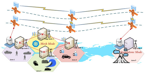 In the past few years, the ground communication network has further expanded and developed with the increase in communication volume worldwide. However, the ground communication network cannot offer equal coverage to remote areas or the edge network due to insufficient resource planning, which leads to unassured communication service quality in these areas. At the same time, satellite communication systems leverage the benefits of high altitude and multicast/broadcast capabilities while complementing traditional ground networks to enable novel mobile communication networks [1]. Increasingly, organizations are initiating projects on the satellite–terrestrial hybrid network (STHN). Notably, OneWeb, O3b, SpaceX, and Telesat are among the companies proposing satellite-based Internet solutions [2]. As shown in Figure 1, owing to its intrinsic benefits encompassing wide scope, efficient processing capabilities, and versatile nature, STHN finds application across numerous practical domains, intelligent transportation systems [3], military tasks, disaster relief [4], etc.
