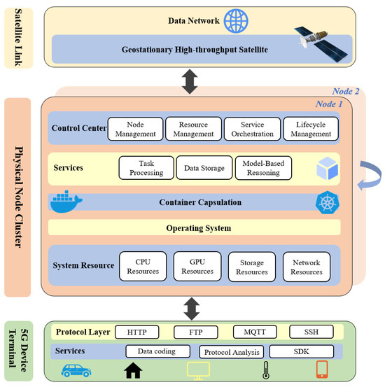 The platform architecture, depicted in Figure 3, consists of three main parts. Nodes integrated with the 5G communication system connect to various terminal devices via the southbound interface, depending on the scenario, such as a plethora of IoT sensors, vehicles in the vehicular network, various communication devices across military and civilian applications, including mobile phones and smart watches. Additionally, nodes integrated with satellite antennas establish a communication link with high-throughput Earth-orbiting satellites via the northbound interface, establishing a connection with the data network. The platform can be deployed on general architectures, including X86 and ARM operating systems. The system resources are virtualized, and various businesses and data can be carried out in a containerized way.