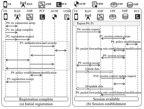 Based on the initial registration and session establishment, these two fundamental processes clearly demonstrate the control signaling interactions among various network functions in the core network when fulfilling user service requests. Figure 4 illustrates the procedures for the initial registration and session establishment in the context of 5G network deployment. During the UE’s initial registration, the Authentication and Mobility Management Function (AMF) authenticates the UE and communicates QoS/billing profiles to the Session Management Function (SMF). Following this, the SMF selects a User Plane Function (UPF) to serve as the anchor gateway for session establishment. To initiate uplink data transmission, the UE first establishes a radio connection with the base station, which subsequently sends a service request to the AMF. The AMF, in turn, replicates session states to the base station for effective QoS enforcement. For the delivery of downlink traffic, it is imperative for the anchor gateway to notify the AMF of data arrival. Subsequently, the AMF notifies the base station to initiate paging for the UE. If this paging process succeeds, the UE repeats the aforementioned procedure to establish the session anew. Based on the above process, it is possible to quantitatively determine the control signaling overhead between CNFs.