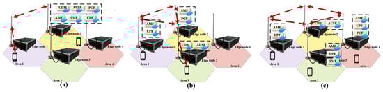 In Figure 5a, a relatively complete core network is deployed only on Edge Node 2. The direct consequence of this is that users outside Area 2 need to incur higher edge control overhead for initial registration and session establishment processes. Additionally, the resource utilization of the entire edge system is severely imbalanced. This is a scenario that we should try to avoid in practical deployments. In Figure 5b, a relatively complete core network is distributedly deployed on Edge Nodes 1, 2, and 3. In this case, the resource utilization of the edge system is more balanced, and it also improves, to some extent, the back-haul control overhead for users in Areas 1, 2, and 3. However, this deployment approach still has drawbacks when the number of users increases, especially when there is a significant increase in users in Areas 3 and 4. This can lead to more frequent interactions between AMF, SMF, UPF, and thus consume a substantial amount of inter-node communication resources. Compared to the first two scenarios, the third deployment scenario is more reasonable. In the above processes, network functions that interact frequently with the terminal, such as AMF and UPF, are deployed on almost every edge node, while network functions related to authentication, such as UDM and AUSF, are concentrated on one node. This ensures load balancing between nodes and effectively controls the control signaling overhead of the system.