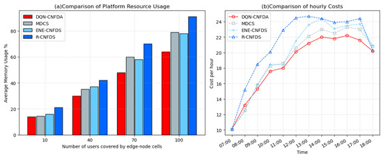 Figure 6a illustrates a comparison of platform resource usage for different schemes as the number of users in the wireless coverage area of edge nodes increases. We use the more intuitive platform average memory usage. Consistent with subjective inference, when the number of users within the coverage of edge nodes increases, the number of running containers in the entire platform also increases accordingly, leading to an increase in platform memory usage. R-CNFDS neglects the control traffic overhead between nodes, resulting in inefficient resource utilization. This situation becomes even more severe as the number of users increases. It is worth noting that when the number of users is small, there is little difference in resource utilization between MDCS, ENE-CNFDS, and DQN-CNFDA. With fewer user requests within the node coverage, the required number of containers to be deployed is limited, resulting in relatively good performance for ENE-CNFDS, even though it does not consider deployment costs as effectively. Additionally, the lower volume of control signaling between nodes does not significantly impact MDCS in terms of control traffic. However, as the number of users increases (e.g., when a single node covers 70 to 100 users), DQN-CNFDA outperforms MDCS and ENE-CNFDS in effectively managing the relationship between deployment costs, control traffic, and dynamic user requests. It efficiently scales network functions on each node, leading to more pronounced advantages in system resource utilization.