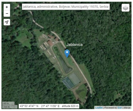 The altitude of the trout pond of Jablanica is 820 m, and the geographical coordinates are 43°53′47.47″ north latitude and 21°47′11.55″ east longitude. Figure 1 shows the exact location of the trout pond of Jablanica in Google Maps. A dam on the river of Radovanska Reka that directs the flow of water into the fishpond is located near the source of that river. In addition to the settling basin, the fishpond contains 15 feeding and 6 spawning basins for fish. The river of Radovanska Reka has excellent conditions for the life and growth of different species of trout. The microclimatic conditions around this fishpond are favorable, i.e., the water does not freeze in the winter, and the pond is surrounded by hills that protect it from a stronger wind effect.