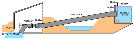 In previous periods, the trout pond of Jablanica has been supplied with electricity from a diesel generator only. This study proposes a hybrid power system configuration that would utilize the available renewable energy sources (water and solar radiation) as well as the existing construction and infrastructure of the fishpond. As already mentioned, the proposed hybrid power system would consist of the MHPP, PV generator, diesel generator, converter and storage battery unit. The hydro-turbine in the MHPP is assumed to be a propeller S-turbine that will use water from the settling basin overflow with a net head of 2.9 m. Figure 2 shows a vertical cross-section of the MHPP at the outlet of water from the settling basin, where the numerals represent the height values. The water from the settling basin is directed to the propeller S-turbine by means of a pipe having a diameter of 500 mm and a length of 8 m.