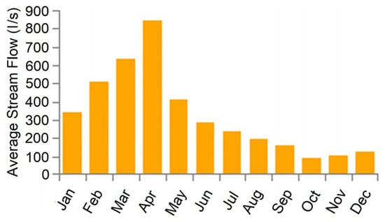 The histogram of the monthly average stream flow for the river of Radovanska Reka is presented in Figure 3. The stream flow (i.e., river flow) decreases during spring and summer, from May to October (the month when the stream flow should be at a minimum of 90 l/s), and increases during the autumn and winter, from November to April (months during which significant rainfalls and snowfalls should occur). The highest monthly average stream flow occurs in April and amounts to 845 l/s. The annual average stream flow and annual average residual stream flow for the river of Radovanska Reka are 328.04 l/s and 32.80 l/s, respectively.