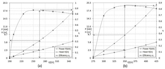 By comparing the curves from Figure 4a,b a significant improvement in the performance parameters of the optimized hydro-turbine design corresponding to Cases 2 and 3 can be observed. In particular, the optimal power output of the turbine increases from 6.4 kW to 8.5 kW, and the optimal flow rate of the turbine increases from 265 l/s to 350 l/s. In addition, it can be seen that the optimal hydro-turbine design can operate with a flow rate of Q = 350 l/s and a net head of H = 2.9 m, achieving an optimal efficiency of η ≈ 0.86. By reducing the flow rate below that corresponding to optimal operation, the efficiency of the hydro-turbine decreases sharply because the propeller blades and guide vanes are fixed. Accordingly, it is assumed in Cases 2 and 3 that the guide vanes can be adjusted so that the hydro-turbine can operate (with lower efficiency) in the summer months and in dry years when the flow rates are significantly reduced (up to 30% of the optimal flow rate). In this particular case, HOMER Pro v. 3.16.2 software is used to estimate the power output and efficiency of the hydro-turbine.