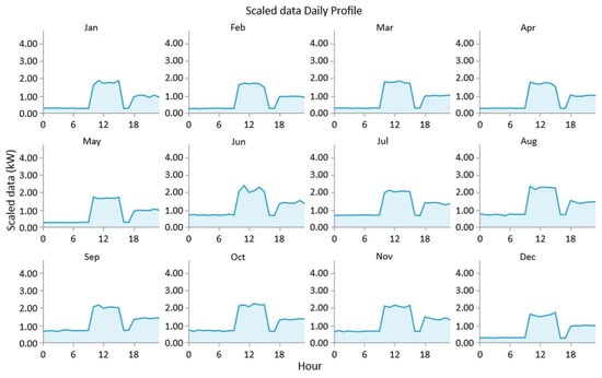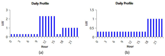 The electricity generated by the proposed off-grid system is used to supply two buildings (equipped with devices), fishpond lighting, an oxygenator, and an ice maker. The typical daily load profile used in this analysis was obtained based on the average daily power requirements of these devices. The typical daily load profiles for the trout pond of Jablanica for days in January are shown in Figure 6.