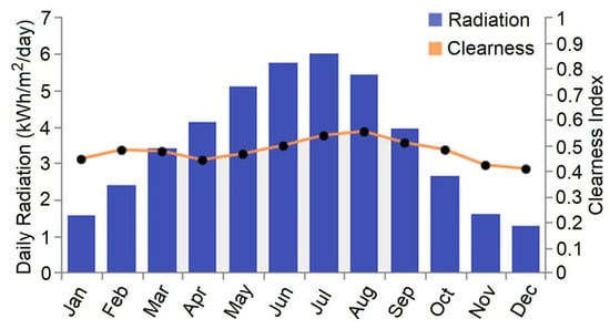 The monthly average values of solar radiation and clearness index for the area of Boljevac are shown in Figure 8. Solar radiation data are obtained from NASA Surface Meteorology and Solar Energy [29] based on latitude and longitude for the municipality of Boljevac, where the trout pond of Jablanica is located.