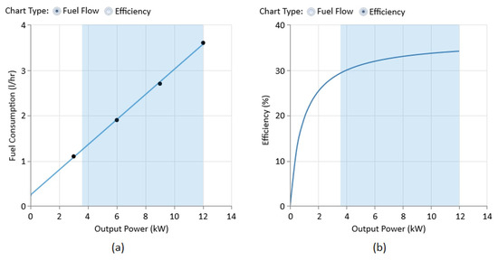 A three-phase Yamaha diesel generator of 12 kW is used [33]. In Serbia, the price of diesel fuel on 16 August 2023 was 1.705 $/l [34,35]. This price is used in the simulations. The corresponding investment, replacement and O&M costs are $3710, $1500 and 0.025 $/h, respectively. The fuel consumption and efficiency curves of the considered diesel generator are presented in Figure 9a,b, respectively. According to Figure 9a, the fuel curve intercept coefficient is 0.0208 l/h/kW (rated), and the fuel curve slope is 0.2767 l/h/kW (output). The lifetime of the considered diesel generator is 15,000 h.