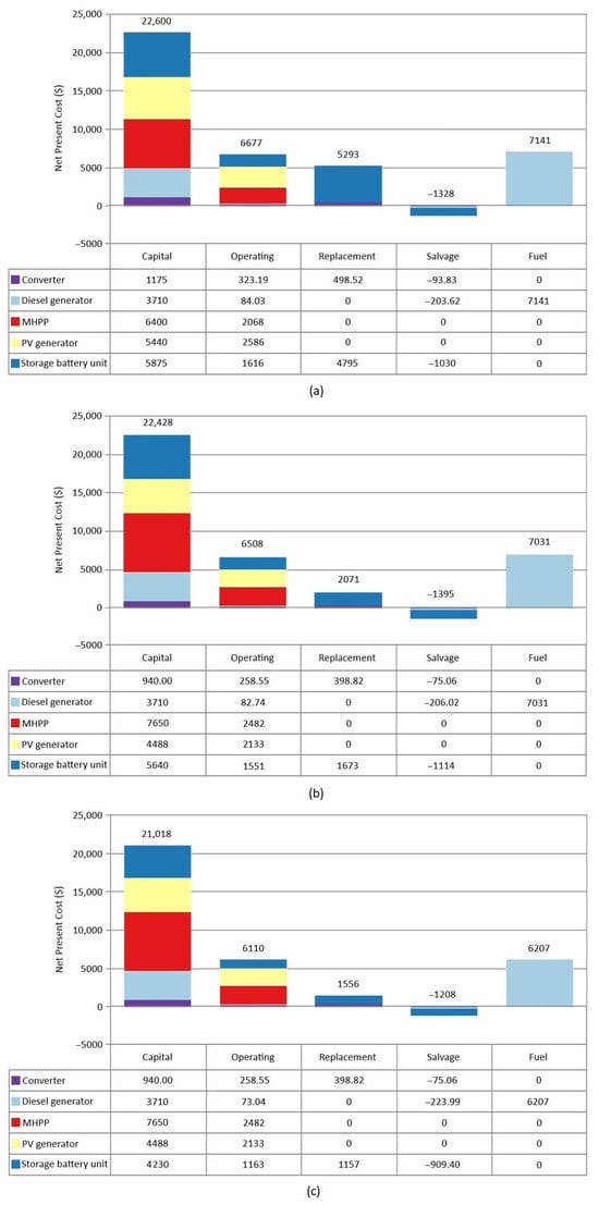 The bar charts in Figure 10 show that the renewables (MHPP and PV generator) have relatively higher capital and operating costs than the diesel generator, but that the diesel generator has high fuel costs. For Case 1 from Figure 10a, the total costs referred to the storage battery unit are the highest, at $11,256. For Case 2 from Figure 10b, the total costs referred to the diesel generator are the highest, at $10,617.72. Whilst, for Case 3 from Figure 10c, the total costs of MHPP are the highest, amounting to $10,132. In all three cases the operating costs of the diesel generator are very low, amounting to $84.03 for Case 1, $82.74 for Case 2, and $73.04 for Case 3.
