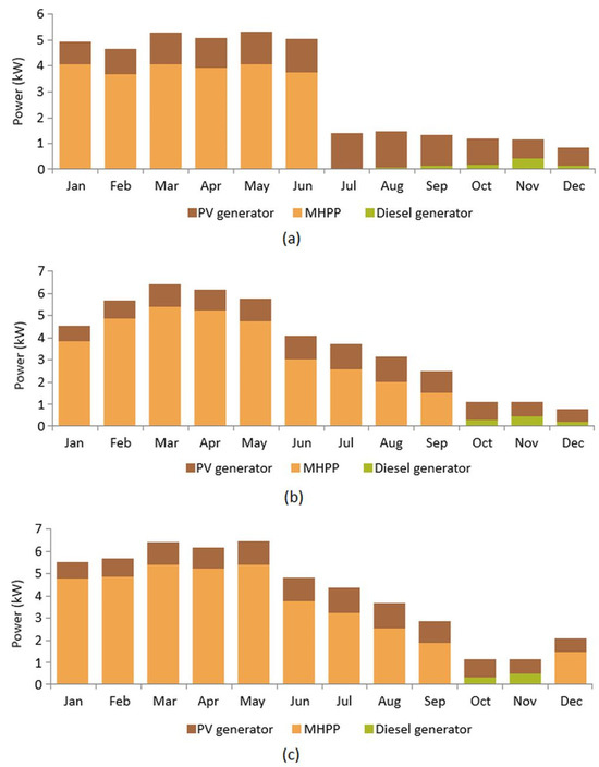Monthly average power output of the MHPP, PV generator and diesel generator for (a) Case 1; (b) Case 2 and (c) Case 3.