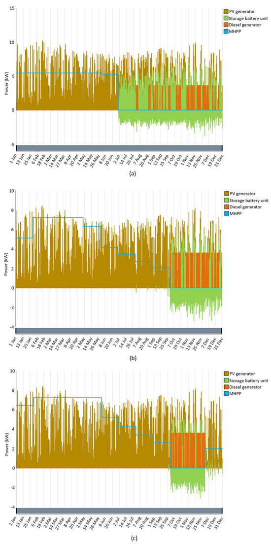 Hourly power output of the MHPP, PV generator and diesel generator, and hourly power input of the storage battery unit for (a) Case 1; (b) Case 2 and (c) Case 3.