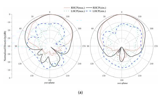 Measured and simulated radiation patterns of the designed CP DRA element: (a) at 26 GHz; (b) at 29 GHz.