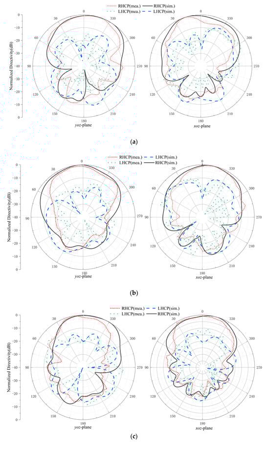 From Figure 19, the measured ARs are lower than 3 dB over 25.80–26.80 (3.8%) and 28.2–30.4 (7.5%) when port 1 works and 25.20–26.10 (3.5%) and 26.70–30.00 (11.6%) when port 2 works. Due to the fabrication errors mentioned in Section 2.3, the simulation results slightly differ from the measured results. Figure 19 shows the measured, simulated circularly polarized gain. The measured average (peak) gain is 5.77 (6.19) dBic at 26.5 GHz to 29.5 GHz when port 1 works and 6.90 (7.27) dBic when port 2 works. The measured and simulated radiation patterns at 26 GHz and 29 GHz are shown in Figure 20. The DRA has a broadside unidirectional radiation pattern at two frequencies, producing RHCP in the +z direction.