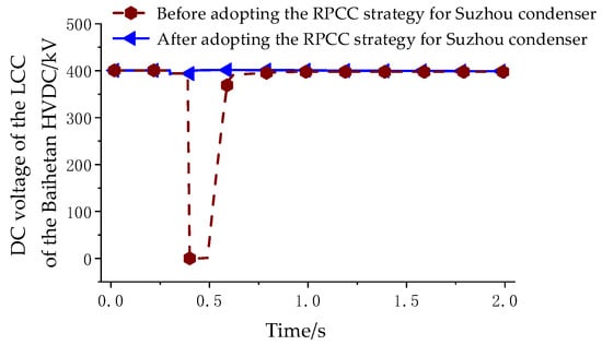 The DC voltage of the LCC of the Baihetan HVDC system before and after adopting the RPCC strategy is shown in the following Figure 5: