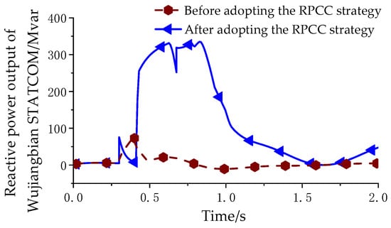 The Suzhou condenser is located near the Jin-su HVDC inverter station to ensure the safe and stable operation of the Jin-su HVDC. However, according to the evaluation results of Equations (15) and (16), the Suzhou condenser can also play an improving role in the LCC on the high voltage side of the Baihetan HVDC inverter station. The following example verifies the effect of the RPCC method applied in the Suzhou condenser on the LCC of Baihetan. When a short-circuit fault occurred near the 500 kV bus Guotaizhou, a comparison of the reactive power output of the Suzhou condenser with and without applying the proposed RPCC strategy was produced and is shown in the following Figure 4: