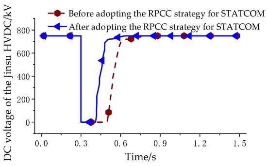 The DC voltage of the LCC of the Jin-su HVDC system before and after adopting the RPCC strategy is shown in the following Figure 9: