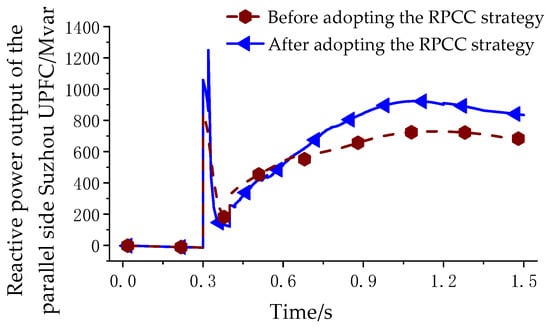 According to the evaluation results of Equations (15) and (16), the parallel side of the Suzhou UPFC can also provide voltage support to the Jin-su HVDC system commutation bus. By adjusting the AC voltage reference value Uref on the parallel side of the Suzhou UPFC according to the proposed control strategy and applying a short-circuit fault at the Suquanfu 500 kV bus, a comparison of the reactive power output on the parallel side of the Suzhou UPFC with and without applying the proposed RPCC strategy was produced and is shown in the following Figure 8: