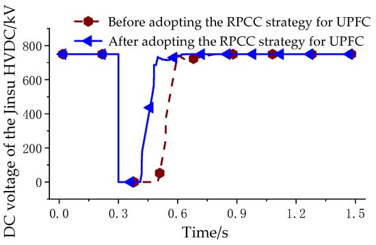 It can be seen that after applying the RPCC strategy proposed in this paper, the reactive power output on the parallel side of the UPFC increases significantly during the fault and the recovery process, thus suppressing the Jin-su HVDC system commutation failure, which is mainly reflected in the significant reduction in the Jin-su HVDC commutation failure duration under some faults. According to the simulation results in Figure 9, the commutation failure duration of the Jin-su HVDC system is reduced from 200 ms to 100 ms, thus reducing the lost energy of the system.
