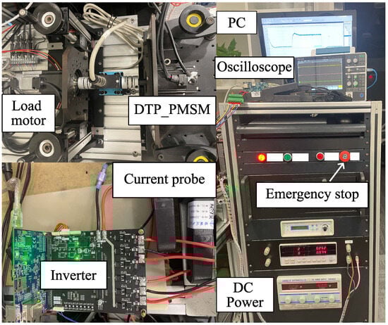 In order to verify the effectiveness of the proposed method, multiple sets of experiments are implemented. In addition, the conventional PI control method is realized for comparison of performance. The controllers are all run in the TMS320F28388D (digital signal processor) manufactured by Texas Instruments. In addition, the DTP-PMSM is mounted on the testbench, and the simulated load is provided by a load motor. The parameters of the DTP-PMSM are listed in Table 1 and the whole experimental platform is shown in Figure 3.