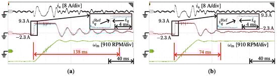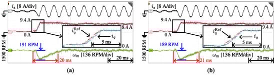 Figure 4 presents the experimental results of the a-phase current , the reference and actual values of the current in the q-axis, and the mechanical speed when the motor is reversed. The figure shows that the tracking performance of the q-axis current suffers from a large latency and a steady state error when using a conventional PI controller, while the proposed method demonstrates a better satisfactory tracking performance and eliminates the steady state error. In addition, the settling time of the speed is reduced from 138 ms with the PI controller to 74 ms with the proposed method, which further validates the effectiveness of the proposed method.