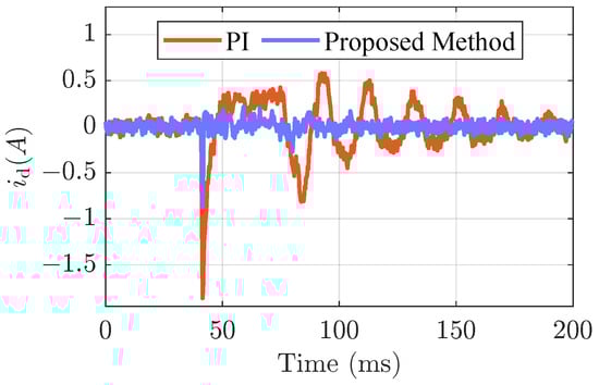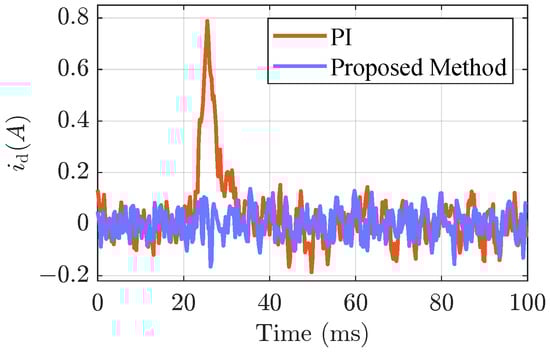 Figure 7 shows the dynamic experimental results of different controllers under load disturbance. The figure shows that the PI controller has a maximum speed drop of 191 RPM with a settling time of 20 ms under load disturbance, while the proposed method has a maximum speed drop of 189 RPM with a settling time of 21 ms, which indicates that the proposed method has similar performance to the conventional controller. However, Figure 8 shows that for the d-axis current tracking performance, the conventional PI controller has a large current overshoot of 0.79 A. The proposed method eliminates this overshoot, and the maximum overshoot is only 0.10 A, which demonstrates that the proposed method can provide satisfactory current tracking performance, especially for the d-axis current during the load vibration.