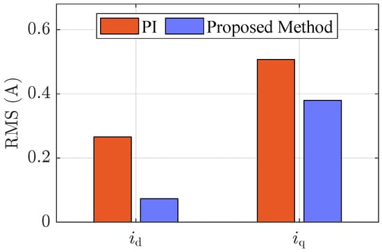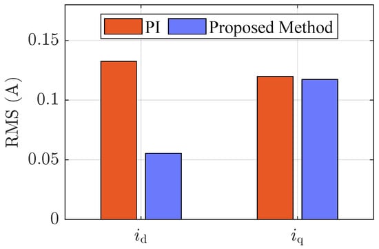 In addition, the RMS results of the d-axis and q-axis current following errors are presented in Figure 9. For the q-axis current, the RMS of the following errors with the conventional method and the proposed method is 0.12 A and 0.12 A, respectively, which are quite similar. Nevertheless, for the following error of the d-axis current, the RMS values are 0.13 A and 0.06 A, respectively. This indicates that the proposed method provides more efficient performance for d-axis current tracking.