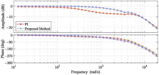 For further investigation into the dynamic performance of the proposed method, frequency response experiments of both PI and the proposed controller are realized. The load motor is removed from the mechanical coupling since free rotation is required for the test motor. Additionally, a sinusoidal signal with an amplitude of 1.85 A and a frequency from to is injected into the q-axis current of the test motor. By collecting the response results of the current and analyzing them in comparison with the injected signal, one can obtain the closed-loop frequency response plot of the system, as shown in Figure 10. The figure shows that the closed-loop bandwidth of the conventional PI method has only , while the proposed method increases the bandwidth to . Therefore, the proposed method effectively increases the bandwidth of the closed-loop system and offers sufficient current tracking capability.