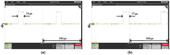 Predictive controllers are often known for having significant computational burdens; therefore, the computational time consumed by different controllers is evaluated. By toggling the output port before and after the controller operation, the running time of PI and proposed controller are measured by an oscilloscope as shown in Figure 11. The longer the computation time, the more resources the method consumes. From the figure, it is clear that the computational time consumed by the conventional PI controller is while the proposed method consumes , which is not a significant increase in time. This is because the predictive controller used in the proposed method directly computes the optimal control result without iterative solving or searching for all the available voltage vectors.