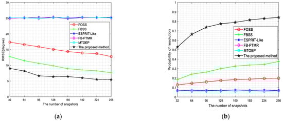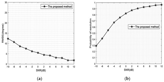 Figure 4 illustrates that our proposed method provides good estimation accuracy over the entire snapshot regime. When compared with the other methods, our proposed method can realize the array aperture extension using the Khatri–Rao subspace processing. Thus, our proposed method yields better estimation accuracy and resolution under the same snapshot number. Figure 4 also shows that the DOA estimation performance for our proposed method is significantly improved faster than other methods as an increase in the number of snapshots. This is especially true for a low number of snapshots such as 96; our proposed method can provide better estimation accuracy () than other methods (). Moreover, the resolution of probability in our proposed method is about , while those of the others are below .
