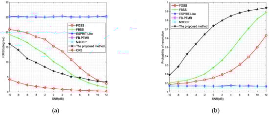 Figure 3 also shows that when , our proposed method provides better estimation performance on accuracy and resolution. Meanwhile, the DOA estimation performance is closer to CRB than other methods. Furthermore, the proposed method can produce a slightly interior RMSE performance at higher SNRs than the FBSS method, but the resolution probability in our method obviously outperforms the FBSS method. Particularly when , our proposed algorithm improves estimation accuracy () and resolution probability () than that of other methods (, ).