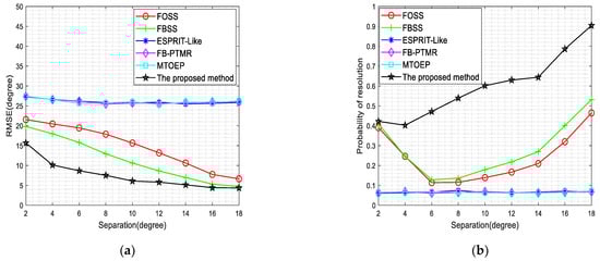 From the simulation results as shown in Figure 5, we can conclude that our proposed method provides better estimation performance than that of other estimators across the entire angular separation regime. Compared to the FOSS and FBSS methods, our proposed method achieves the extension of the array physical aperture when combined with the Khatri–Rao subspace processing. Therefore, this will result in better estimation accuracy. Furthermore, Figure 5 also shows that when the angular separation is enlarged, the RMSEs of the spatial smoothing methods gradually approach and are still lower than our proposed method. Meanwhile, the resolution probability of our proposed method is also significantly improved. In particular, when the angular separation , the estimation accuracy of the FBSS is similar to our proposed method, while the resolution probability () in our scheme is higher than that of the FBSS method ().