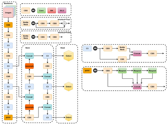 The YOLOv5s backbone network comprises the C3, CBS, and SPPF structures. The C3 structure divides input features into two parts, inspired by the cross-stage network CSPNet [20]. The main part progressively extracts features through convolution, normalization, and activation functions. Meanwhile, the branches adjust the channels using convolutional layers, effectively eliminating redundant gradient information. On the other hand, the structure of CBS incorporates a Conv layer, a BatchNorm layer with normalization techniques [21], and the SiLU activation function [22] to enhance feature extraction in multi-scale object detection. This combination enhances the network’s ability to characterize the input. Lastly, the SPPF architecture utilizes multiple 5 × 5 maximal pooling layers to enhance the sensory diversity at various levels of the network, resulting in the incorporation of more comprehensive hierarchical features. The YOLOv5s backbone network offers substantial improvements in the design simplicity, accuracy, and speed compared to the two-stage algorithm by incorporating these structures.