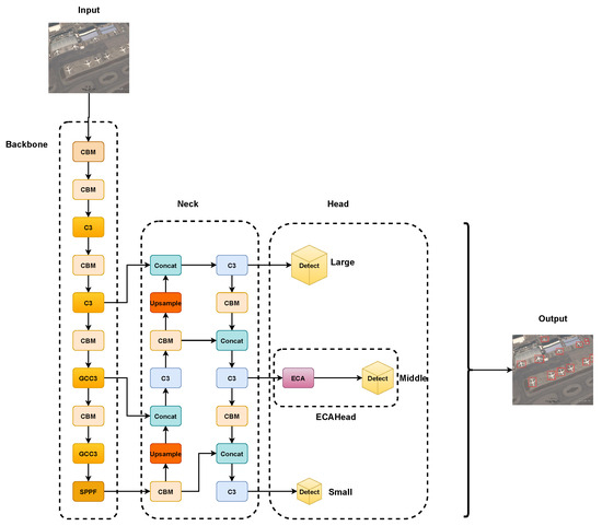 Figure 2 visually represents the overarching structure of our proposed YOLO-GCRS. The procedure commences by extracting features from the input remote sensing images employing the GC-C3 and CBM architectures. These structures play a crucial role in capturing relevant information. Subsequently, the features are fused at multiple scales through the neck structure, enabling a comprehensive understanding of the image. Finally, the ECAHead is employed to extract high-dimensional channel information, and the prediction information is outputted.