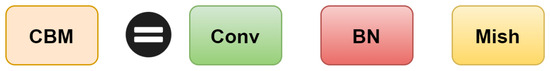 YOLOv5s utilizes the Convolution + BatchNormalization + SiLU (CBS) convolution block to extract feature information. The SiLU activation function, which is implemented by the Swish activation function, is used within this block. A new module called Convolution + BatchNormalization + Mish (CBM) is introduced to improve the network’s ability to extract deep-level features and improve the accuracy.The CBM convolutional block’s structure is shown in Figure 6.
