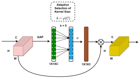 Hu et al. were the first to introduce the SE attention mechanism, which initially compresses the input feature maps, but this compression and dimensionality reduction can hinder the learning of inter-channel dependencies. In contrast, the ECA attention mechanism [29] avoids dimensionality reduction and effectively captures local cross-channel interactions by utilizing one-dimensional convolutions. This allows for the extraction of inter-channel dependencies. Figure 7 illustrates the architecture of the ECA attention mechanism. The specific implementation steps of the ECA attention mechanism are as follows: