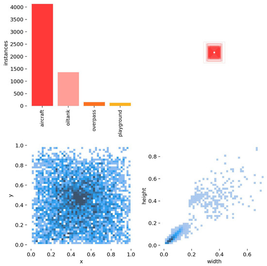 Additionally, Figure 8 and Figure 9 provide a thorough representation of the sample RSOD dataset and its fundamental features. The visual representation reveals the presence of numerous small targets within the dataset, accompanied by intricate background information. Additionally, the dataset exhibits a multi-scale distribution, emphasizing the diverse range of object sizes present.