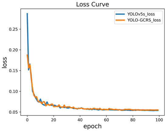 An evaluation of the network training effectiveness can be performed by analyzing the loss function curves. Figure 10 illustrates the loss function curves for the YOLOv5s and YOLO-GCRS models.