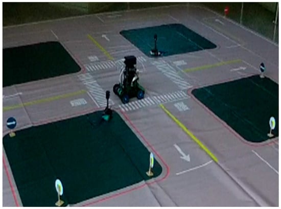 Our previous work [5] shows a small model car, NVIDIA JetRacer, and uses it to realize self-driving scenario simulation. JetRacer is an autonomous AI racer using NVIDIA Jetson Nano. Simulation examples and interactive programming can be accessed from a web browser using a JetRacer, which features optimized high frame rates for high-speed movement. A self-driving scenario was made using a JetRacer, with seven cameras around a planar road map for the simulation and self-driving test, as shown in Figure 1. In Figure 1, many small-sized speed limit signs, turn signs, and traffic lights are installed on the planar road map where the JetRacer can be operated to drive and follow traffic rules.