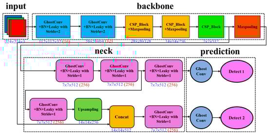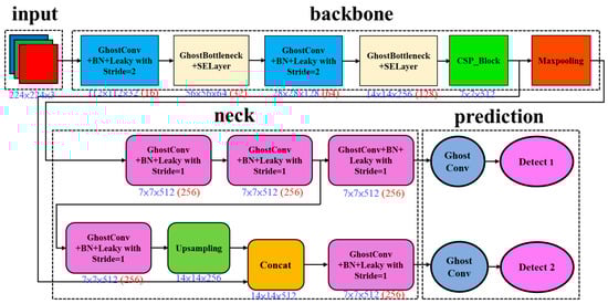 LWGSE-YOLOv4-tiny architecture where the “GhostBottleneck+SELayer” block replaces “CSP_Block+Maxpooling.” Numerical number in red indicates the number of filters in convolutions.