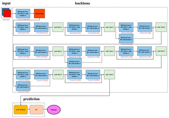 The overall process of DS Conv helps to reduce the computational cost because it uses fewer parameters in the convolution operation of these two stages, which can achieve computational efficiency while maintaining the performance of convolutions. Technically, this study has simplified the original Ghost Conv to be depthwise separable and ghost convolution (DSGhost Conv), which can construct the LWDSG-ResNet18 model, as shown in Figure 11. Algorithms 1 and 2 provide the execution flow of DSGhost Conv in detail. In Algorithm 1, DS Conv computes intrinsic feature maps. Then, in Algorithm 2, Ghost Conv takes a series of simple linear transformations of intrinsic feature maps, generating ghost feature maps.