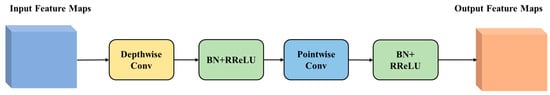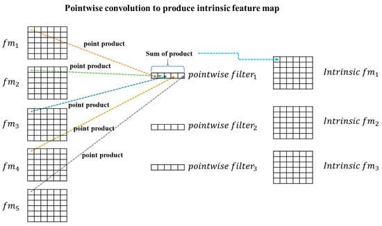 In Figure 5, the proposed LWDSG-ResNet18 model adopts a highly efficient convolution called depthwise separable convolution (DS Conv) [8] substituted for a traditional convolution to produce a set of intrinsic feature maps before entering ghost convolution. The primary purpose of DS Conv is to reduce the computational cost while maintaining the model’s performance, as shown in Figure 8. In addition, we also propose RReLU activation to replace the ReLU activation function in the DS Conv to optimize the model’s performance further. In Figure 9, DS Conv consists of depthwise convolution and pointwise convolution. In the depthwise convolution, each input channel applies a convolution filter independently, effectively capturing the spatial relationships in the input image. In other words, this convolution emphasizes feature interactions inside individual channels. Then, in the pointwise convolution, the output channels of the previous convolution are linearly combined to produce the final feature map of the output channels. It performs cross-channel combinations, enabling the model to obtain satisfactory feature representations with relatively few parameters. Regarding pointwise convolution, Figure 10 provides a more detailed description of how to produce a set of intrinsic feature maps as input feature maps in the subsequent ghost convolution. We can refer to the previous paper [5] to show the steepest gradient descent algorithm, which can update the weight matrix continuously and the bias matrix , optimizing the matrixes [5] for ghost convolution during the training phase.