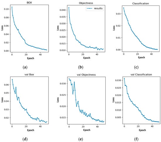 Losses in training and validation for LWGSE-YOLOv4-tiny. (a) Loss in box training. (b) Loss in objectness training. (c) Loss in classification training. (d) Loss in box validation. (e) Loss in objectness validation. (f) Loss in classification validation. Each plot indicates that the x-axis represents the error value and the y-axis stands for the number of epochs.
