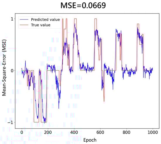 We can compute the execution speed and accuracy of each model by testing the steering angle prediction of 1000 images. Figure 16 plotted the predicted and actual values. In Figure 16, “−1” represents turning right, “1” stands for turning left, and “0” means going straight where the turning point has a limited scale between −1 and 1. The red indicates the actual steering angle, and the blue shows the predicted steering angle. The results from the other models can refer to our previous work [5]. In Table 6, Equation (3) computes FPS, and Equation (5) computes MSE. In short, this test shows that the LWDSG-ResNet18 achieves the smallest MSE, and the Nvidia-CNN performs the worst.