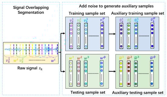 As illustrated in Figure 1, there are different running states of rotating machines, and one running state stands for one type in the fault diagnosis task, and denotes the -th type of raw vibration signal (). Firstly, the overlapping segmentation sampling is executed on each type of raw vibration signal. Specifically, the overlapping sampling of is carried out with a sampling interval of . Then, the one-dimensional samples, and , represent the training samples and testing samples, respectively.