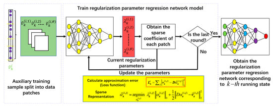 It can be seen from Figure 2 that the input layer is composed of nodes, there are three hidden layers, and the numbers of nodes are , , and , respectively. The output layer is composed of a single node, which is the regularization parameter. The parameters of this network are randomly initialized using the Kaiming Uniform method. Based on the above constructed regularization parameter regression network, the specific training process is described in Figure 3.