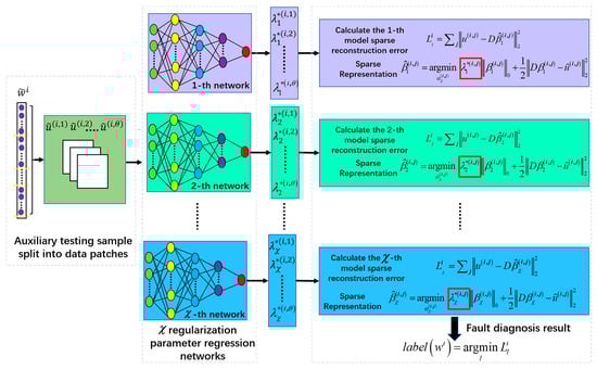 Figure 4 illustrates the fault classification process for the testing sample . Firstly, regularization parameter regression network models are gained according to the training method in Section 3.2. The corresponding patches of the auxiliary testing sample are input into the regularization parameter regression network models, respectively. Then, the different types of regularization parameters are acquired for the current testing sample .