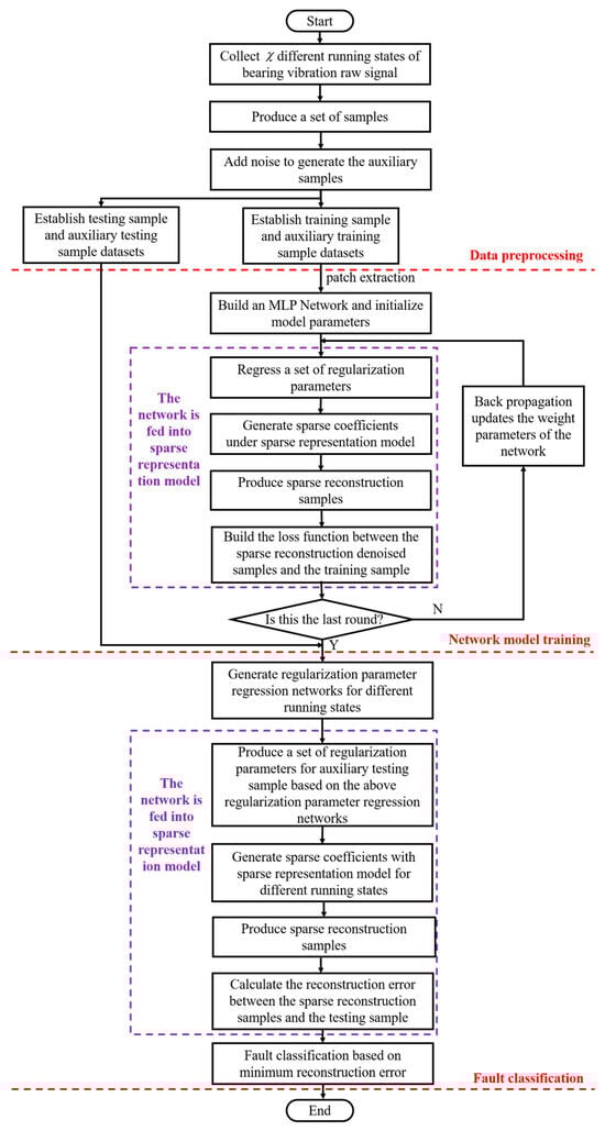 To sum up, Figure 5 shows the complete flow chart of the proposed SR-DEEP intelligent fault diagnosis method, which is mainly divided into three basic modules, which are data preprocessing, training regularization parameter regression network model, and fault classification. The overall steps of the SR-DEEP method are summarized below.